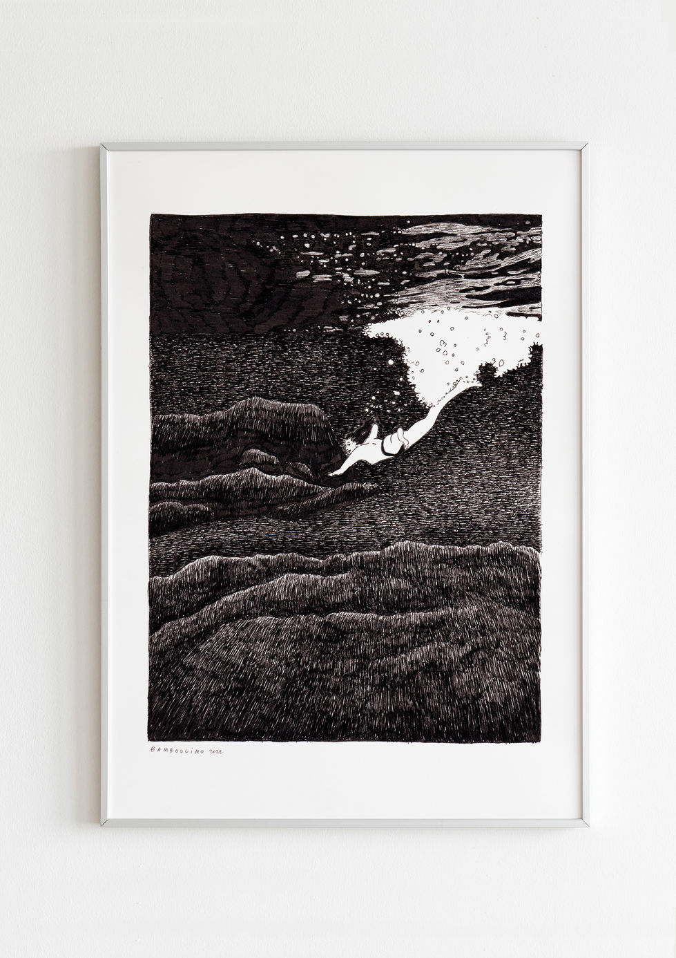 "La Mini Plage", dry pastels and black ink, 29,7 x 42 cm.